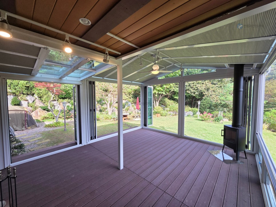 썬룸 바닥은 난로 사용에 용이하며 내구성이 높은 합성데크로 마감되었습니다.