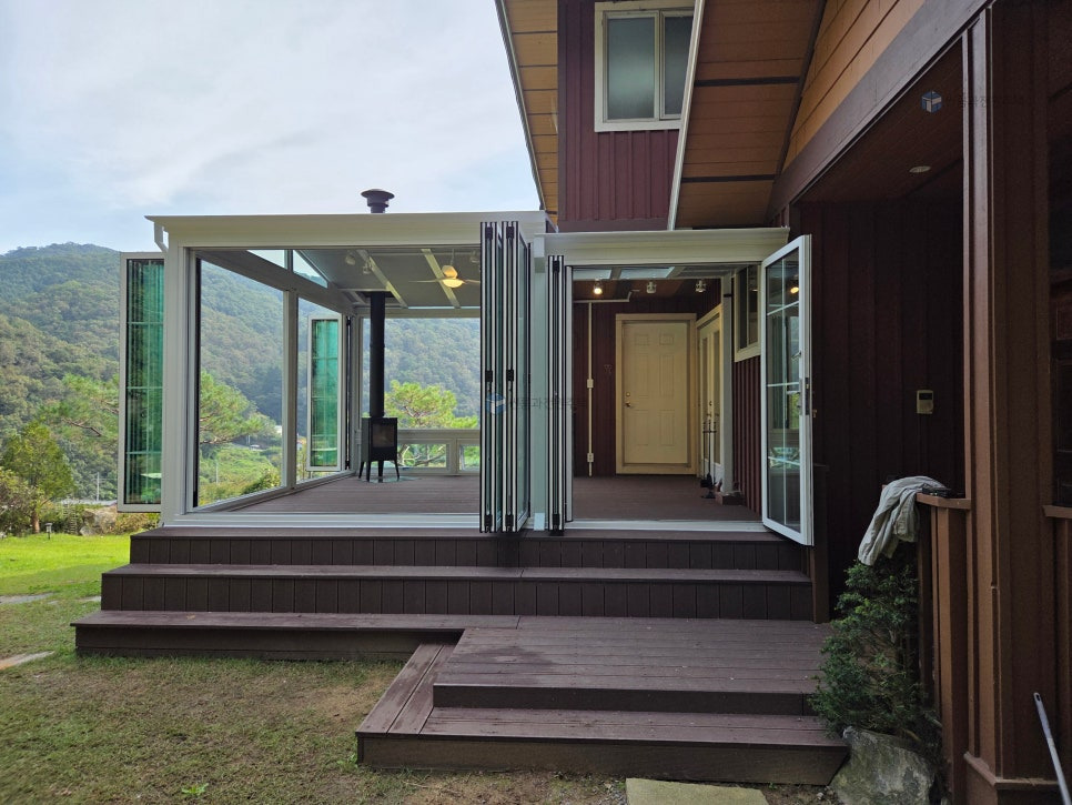 썬룸 전면의 폴딩도어가 양쪽으로 완전히 접혀 열린 모습입니다.